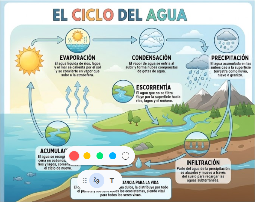 Crea un organizador gráfico claro, didáctico y visualmente atractivo sobre el ciclo del agua, en español. El organizador debe incluir: 1. Título principal: “El ciclo del agua”. 2. Las etapas principales: evaporación, condensación, precipitación, infiltración, escorrentía y acumulación. 3. Una definición breve y sencilla de cada etapa. 4. Flechas o conectores que muestren la secuencia del proceso de forma cíclica. 5. Íconos o dibujos representativos como sol, nubes, lluvia, ríos, lagos, mar y suelo. 6. Colores suaves y estilo educativo, ideal para estudiantes. 7. Distribución ordenada, fácil de leer y comprender. 8. Un pequeño resumen final que explique por qué el ciclo del agua es importante para la vida en la Tierra. Haz que el diseño tenga apariencia de infografía o mapa conceptual, con texto breve, lenguaje sencillo y buena jerarquía visual.